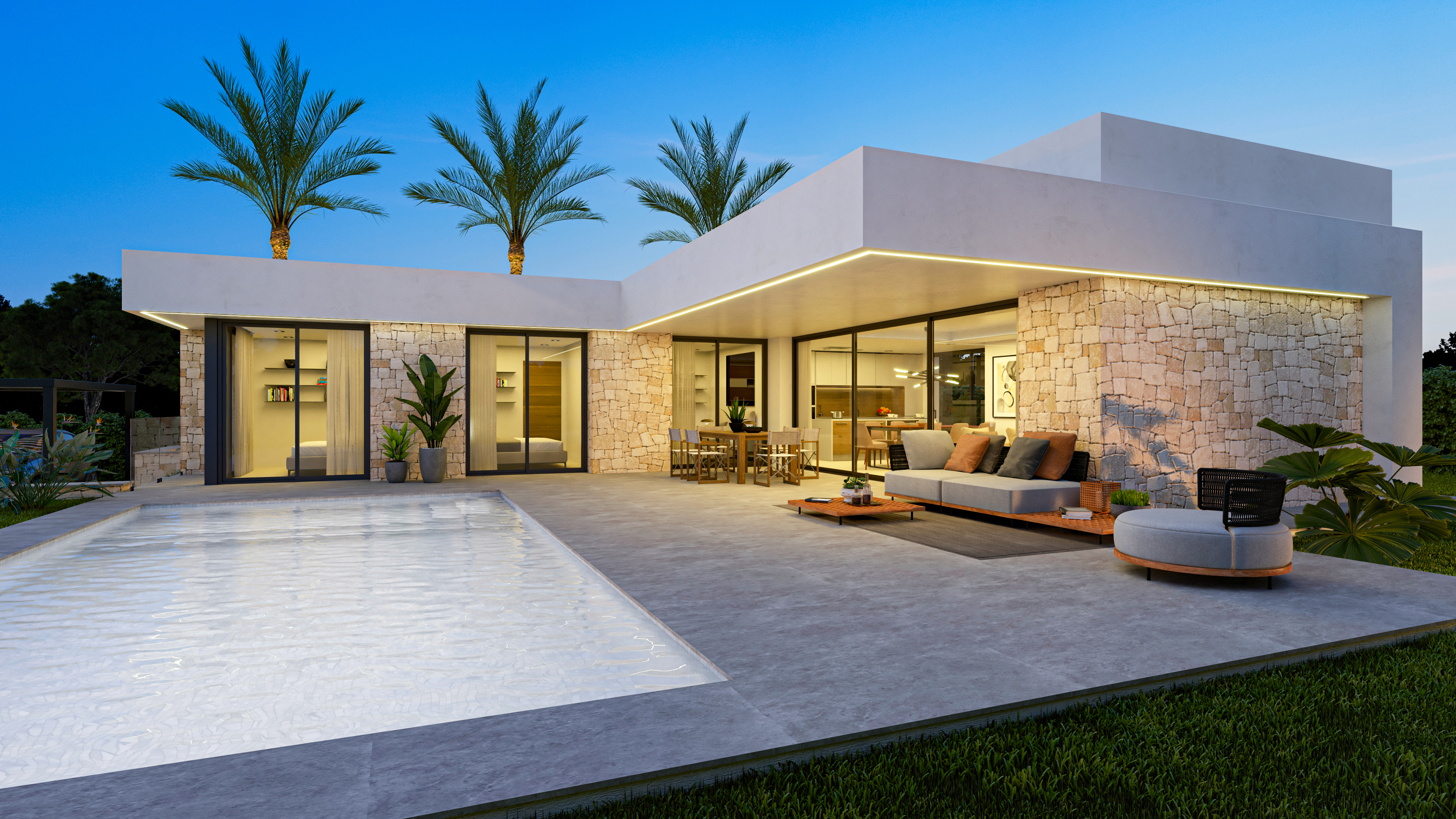 This modern one-floor home offers abundant light and seamless connections between spaces. It features a spacious living-dining area, open-concept kitchen, private bedrooms, and a beautiful outdoor setting with a terrace and pool, ideal for Mediterranean living.