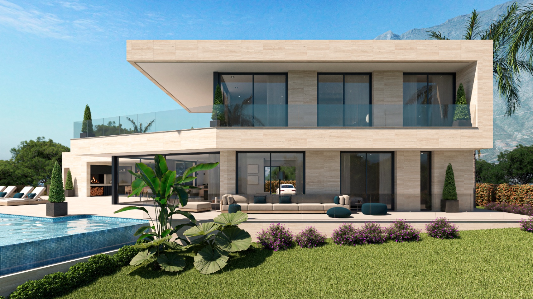 This spectacular villa in Santa Lucia, Dénia, features a travertine façade and stunning Mediterranean Sea views. Designed for luxury, it includes a large garage, multipurpose spaces, guest suites, and an infinity pool blending with the ocean.