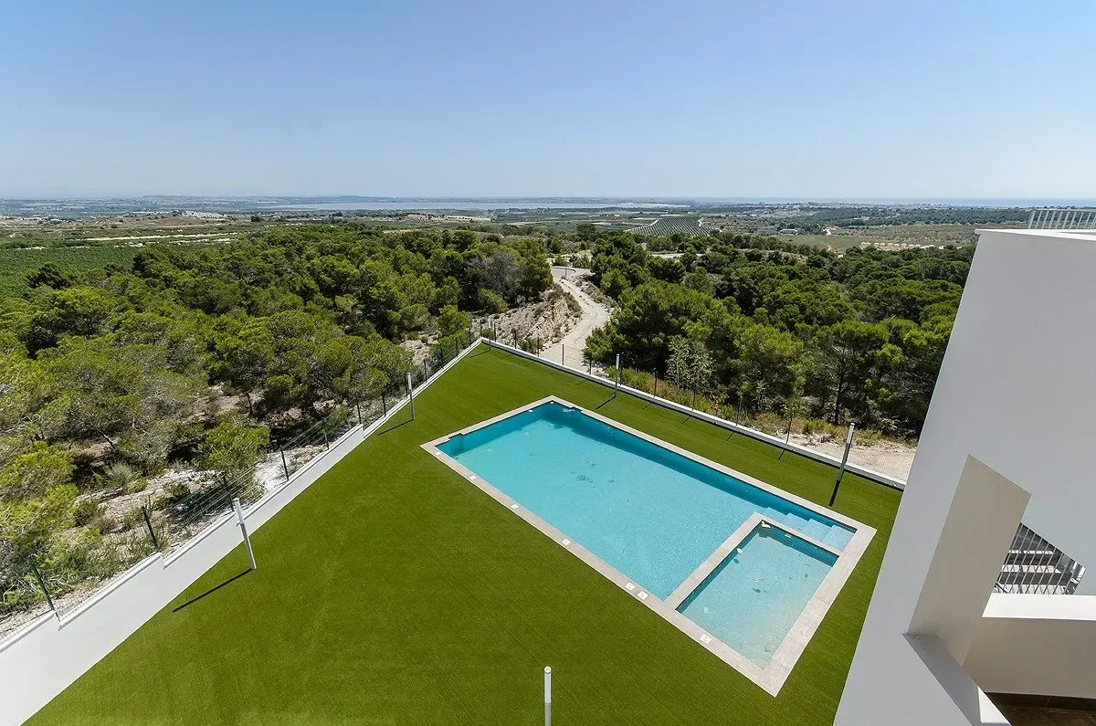 New build bungalows in San Miguel de Salinas offer 2-3 bedrooms, with solarium or garden options and parking. Communal area includes garden and pool. Located near golf courses with views of lagoons.